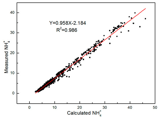 where SO42−, NO3−, and NH4+ are the mass concentrations (μg·m−3) of each species divided by their molecular weights; 18 is the molecular weight of NH4+. It should be noted that in this equation negative ions are assumed to be neutralized completely by NH4+; hence, the resultant salts are ammonium nitrate, ammonium sulfate, and ammonium chloride. Additionally, metal cations and organic acids are neglected. In this study, the concentrations of other ions were extremely low compared with those of SO42−, NO3−, and NH4+; thus, the use of this equation is valid. If the calculated value is similar to the observed value, then this indicates that PM10 exists in a neutral state, while higher calculated values suggest it is acidic. In Figure 4, it can be seen that the calculated NH4+ concentrations were equal to the observations, with a slope of 0.986. This indicates that the WS ions in PM10 in Shenyang air exhibited a state of neutrality.