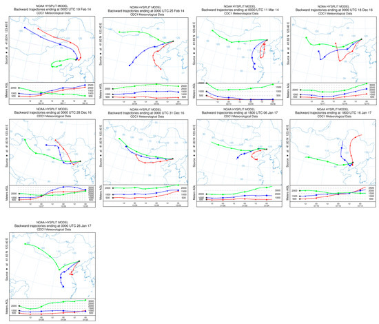 Coal-burning was the most common source of pollution during winter in Shenyang. As is shown in the analyses of the 72-h backward trajectories of Episodes 1, 5, and 8 (Figure 5), all air masses at altitudes of 500 m and 1000 m in the backward trajectories came from the northwest, while air masses at 2000 m came from the southwest. These three episodes were classified as coal-burning pollution. The concentrations and sources of pollutants differed due to the different tracks of the air masses at altitudes of 500 m and 1000 m. Concentrations of PM2.5 were highest at 96.5 and 156 µg·m−3, respectively in Episodes 5 and 8, with air mass movements from northwest to southwest.