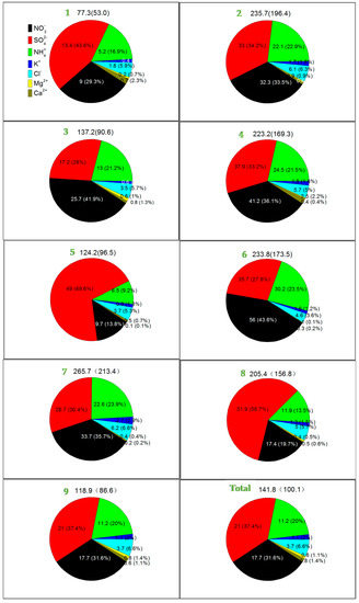 The SNA fractions in PM2.5 were 52.1, 44.6, 61.5, 61.2, 67.6, 70.3, 39.8, 52.0, and 63.7% during the nine haze episodes, respectively; 49.9% over the whole period, and 41.6% in non-haze intervals. These results show that SNA were the principal components of PM2.5 during haze episodes. The SNA fraction (49.9%) was lower than observed in Beijing (55%), but higher than in Shanghai (40%), Lanzhou (26%), and Guangzhou (42%) [25]. These findings indicate that the rise in PM2.5 concentrations in Shenyang was primarily caused by increased SNA, suggesting that SNA play a key role in haze formation.
