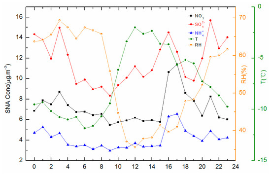 Diurnal variations in SO42−, NO3−, and NH4+ (SNA), relative humidity (RH, %), and temperature (T, °C) on non-haze days.