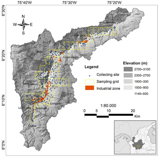 Study area and sampling sites in urban areas of Aburrá Valley (Colombia): Caldas, La Estrella, Sabaneta, Envigado, Itagüí, Medellin, Bello, Copacabana, Girardota and Barbosa.
