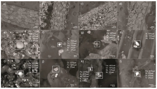 Iron-rich particles are present at all sites; however, their presence and size increase in the following order: residential area < vehicular area < industrial area. Forty-nine characteristic spherules, semi-spherules and irregular Fe-rich particles from 0.3 to 6.6 μm were identified; some of such particles are shown in Figure 3e–l. Analyzed particles were also revealed to have higher sizes in industrial areas (mean size = 2.9 μm; n = 20) than in vehicular areas (mean size = 1.2 μm; n = 12) and residential areas (mean size = 1.7 μm; n = 12).
