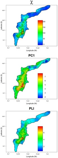 Prediction maps displayed in Figure 4 were built using χ (concentration-dependent magnetic parameter), PC1 (concentration- and grain-size-dependent magnetic parameters, that is, χ, ARM, SIRM, SIRM/χ, and χ/χARM; the first three variables make a higher contribution to the PC according to their loading values), and pollution index PLI as response variables. The selected variables are based on statistical results (Table 3) obtained by combining magnetic parameters and chemical determination of PTE content on each sample.