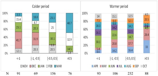 There were 17,114 emergency calls for EABP during the 911 days of the study: 26% of the calls were received in the morning until the early afternoon (8:00–13:59), 44.5%—in the afternoon (14:00–21:59) and 29.5%—at night (22:00–7:59); 60.2% of the patients were older than 65 years. The mean number of EACs during the whole day was 18.8, during the time period of 8:00–13:59 it was 4.9, during the period of 14:00–21:59—8.4 and during the period of 22:00–7:59—5.5 []. The mean daily number of EACs for elderly was 11.3 and for younger patients it was 7.5. No significant difference was observed in the distribution of NAOI categories during the colder and the warmer periods. During the colder period, more days of NAOI < −0.5 were observed in December and more days of NAOI > 0.5 in March (48.7%). During the warmer period, about 30% of days of NAOI < −1 was in June and 58.4% of days of NAOI > 0.5 during the period of April–May (Figure 1).