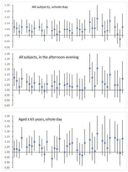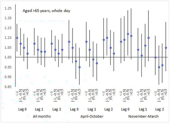 For subjects, aged ≤65 years, during the period of April–October, a higher NAOI (>0.5) was associated with an increased risk of EACs. Also, a positive association between the daily NAOI and the daily EACs was found (Table 1). During the colder period, the risk of EACs was associated both with a lower and a higher NAOI (Table 1). For the elderly subjects, during the period of April–October, an increased risk of EACs was associated with a negative NAO (NAOI < −0.5). Also, the association between the NAOI and the risk of EACs tended to be negative (RR = 0.97, p = 0.065 on the same day) (Table 1).