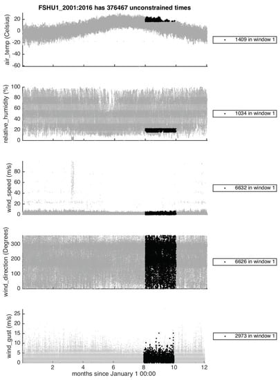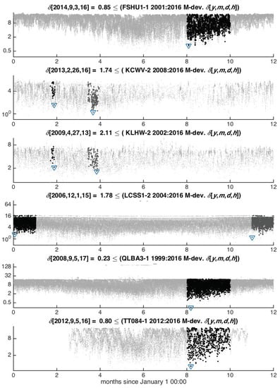 Station data (vertical) vs. month number (horizontal) for station QLBA3 (Lindbergh Hill, 36.285556° N, 112.078611° W, 8800 ft in Arizona) for 1999–2016. Points that do and do not meet the burn-requirements (Table 2) are dark and light gray, respectively, and enumerated in the legends and titles, respectively. The abscissa is for all the years indicated in the title.