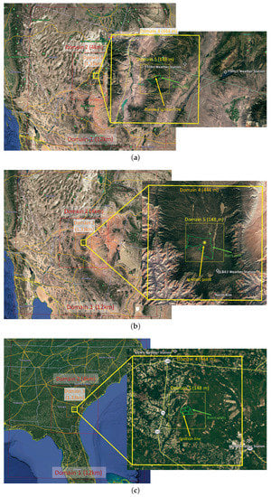 Numerical simulations for the planned experimental burns were performed for the typical days (meeting burn requirements for the specific sites) obtained from the analysis described in Section 2.2, in particular, Figure 1. The numerical experiments were conducted for Fishlake, North Kaibab, and Fort Stewart burn sites, and all used a multiscale setup of telescopic domains of grid scales gradually decreasing from 12 km to 148 m. Each simulation was performed with 30 m-resolution topography, land use and fuel maps from LANDFIRE, and driven by time-varying large-scale weather forcing obtained from Northern American Regional Reanalysis (NARR, [20]). Model configurations used for these runs are presented in Table 1. The domain configurations are shown in Figure 2.