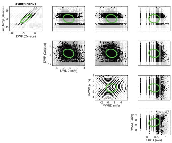 where T is the temperature, is the dew point, u and v are eastward and westward components of the wind vector, and ℓ is the logarithm of the wind gust. The transformed data and their statistics are presented in Figure 4. It is evident from the scatter plots that the transformed state is still not very impressively Gaussian, but certainly is much more Gaussian than the original (temperature, relative humidity, wind speed, direction and gust) description. Also, the ellipse tilts and major-minor axis ratios confirm the general impression of the scatter of data points that meet the burn requirements.