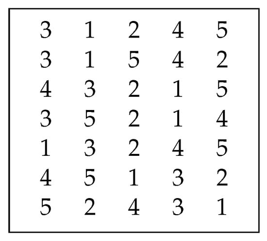Latin Hypercube Sampling (LHS). Each of parameters takes the values from its sampling points. The rows are random permutations of the numbers 1 to 5, while the columns are the parameter vectors on which the simulations will be run.