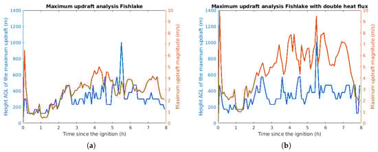 Time series of the maximum updraft strength and location from the Fishlake simulation for 09/03/2014. (a) Standard simulation; (b) Simulation with doubled fire heat flux released to the atmosphere.