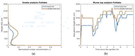As shown in Figure 6, for the standard and doubled heat flux fire simulations, maximum updraft velocities tended to spike during the ignition and then gradually rise over the next 4 h. The maximum updraft velocities reach 5 m/s in the standard simulation and twice as much in the simulation with the doubled heat flux. The elevations where maximum updrafts occur are significantly less sensitive to the fire heat flux enhancement. In both cases, they vary between 170 m and 1000 m. These simulations suggest that from the standpoint of the plume characterization it is important that the experimental burn lasts long enough so that the smoke column fully evolves (at least a couple of hours). The vertical in-plume velocity measurements (LIDAR vertical scans, UAV platforms) should allow for plume scanning up to at least 1.5 km and be able to withstand vertical velocities up to 10 m/s. To provide a guideline for the in-plume measurements of chemical species, the simulations were executed with fire smoke represented as a passive tracer. Figure 7a shows vertical profiles of the smoke concentration normalized by its maximum value for the baseline simulation and the case with doubled heat flux. Both cases show similar concentration profiles with a maximum near the ground and a single peak located around 800 m above the ground level. In the double-heat case smoke penetrates into higher elevations. The time series in Figure 7b show a rapid plume rise during the ignition, followed by a 2 h period of constant plume top height, followed by a sudden drop and a gradual increase with some further fluctuations. As the heat released during the ignition procedure is also doubled in the double heat flux case, the differences in the plume top heights between the cases are most evident during the first 2 h after ignition. Later, as the plume fully develops, the plume heights in these two simulations become similar (within 250 m). The concentration plots presented in Figure 7a suggest that plume sampling should be focused on the layer 3000 m AGL (Above Ground Level), with a particular focus on the 500 m and 1500 m AGL, where the simulations tend to produce the highest tracer concentrations. It has to be noted that as the plume evolves in response to the changing atmospheric conditions and the fire behavior the elevation of the plume layer may change rapidly.