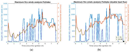 Analysis of the fire-induced winds for the Fishlake simulation executed for 09/03/2014. (a) Time series of the maximum fire-induced horizontal winds and their heights in the baseline case; (b) Same in the double heat case.