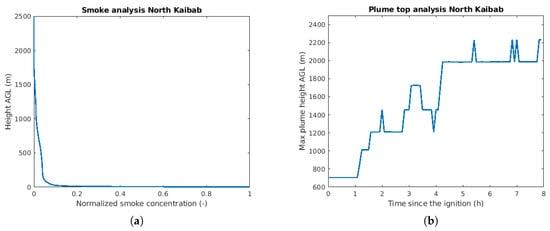 Smoke analysis for the North Kaibab burn simulation executed for 09/05/2008. (a) Vertical profile of normalized smoke concentrations; (b) Time series of the simulated plume top height.