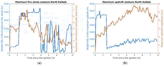 Analysis of the fire-induced wind and updraft for the North Kaibab simulation executed for 09/05/2008. (a) Time series of the maximum fire-induced horizontal winds; (b) TTime series of the maximum fire-induced updraft.