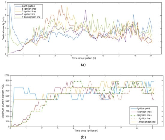 Results from numerical simulations for Fort Stewart (02/14/2013) with different ignition procedures. (a) Time series of the simulated maximum fire-induced updraft; (b) Same for plume top height.