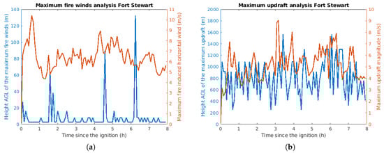 Analysis of the fire-induced wind and updraft for the Fort Stewart simulation executed for 04/22/2014. (a) Time series of the fire-induced maximum horizontal wind speed; (b) Same for the updraft.