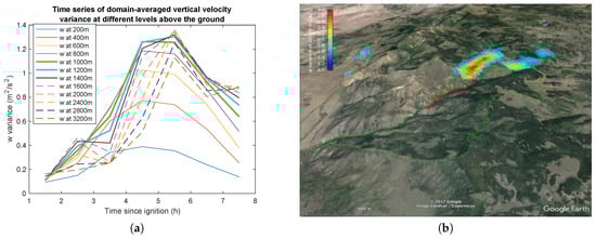 The evolution of the fire-induced flow is presented in Figure 10. The fire-induced winds, in this case, are similar in magnitude to the Fishlake baseline case, but their time evolution is different. Contrary to the winds from the Fishlake simulation showing a strong initial spike in fire-induced winds followed by a gradual increase, the North Kaibab winds ramp up to about 4 m/s, reaching a maximum of about 7 m/s at 2.5 h into the simulation, and then keep decreasing. The timing of the peak surface winds corresponds to the time when the maximum updraft is located relatively close to the surface (below 500 m AGL). The convective updraft evolves gradually in time, reaching maximum values close to 6 m/s after 5 h since ignition. Please note that as a result of a point ignition (less intense than the line ignition in the Fishlake burn), this evolution is not disturbed by the initial ignition-induced spike evident in the Fishlake run (Figure 8). The updraft analysis shown in Figure 10b indicates that over the first one-and-a-half h, the maximum updrafts are located at 2500–3000 m AGL (probably as an effect of fire-induced disturbance inducing vertical mixing at high elevations). As the fire evolves, updrafts in the plume core intensify and become dominant, which is indicated by the elevations of the maximum updrafts going back to 500–1000 m AGL.