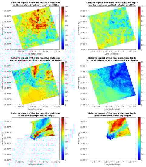 The most critical parameters controlling the vertical velocity, smoke concentration and the plume top height are shown in Figure 16. The heat flux multiplier contributes to the variance of vertical velocity, smoke concentration and the plume top height up to 50%. Unsurprisingly, the fire heat flux plays the major role in driving the plume rise, which indicates the importance of a detailed fire heat characterization during experimental burns. The second most significant contribution (up to 40%) comes from the heat extinction depth, defining the depth over which the fire heat flux is distributed vertically in the model. The extinction depth seems to have an impact of similar magnitude on the variables of interest like the heat flux multiplier, but its character is different. Figure 16 suggests that the heat flux multiplier has the opposite effect on the extinction depth. For instance, the vertical velocities are impacted by the heat flux multiplier mostly downwind (northeast) from the fire (see left top panel). The extinction depth, on the other hand, affects mostly vertical velocities upwind from the fire (see right top panel). Similarly, the smoke concentration is impacted by the heat flux in the north-eastern part of the domain, while the extinction depth seems to impact mostly the south-western part. A similar situation can be observed in the bottom panels of Figure 16, showing the impact of these parameters on the plume top height. Here, the heat flux impact is confined to the very core of the plume, while the extinction depth has the most pronounced impact on the sides of the plume. The differences in these patterns indicate that the placement of the sensor optimal form the perspective of constraining the heat flux may be not optimal for constraining the extinction depth and vice-versa. Also, the patterns of the heat flux contribution seem generally more organized than the ones of the extinction depth. The impact of the extinction depth seems to have non-local character especially when vertical velocity and smoke concentration is considered, spreading across large areas upwind from the fire. That suggests that estimating the extinction depth through the observations of vertical velocities and smoke concentration may be difficult, and may require direct tower-based observations of the vertical attenuation of the fire heat flux.
