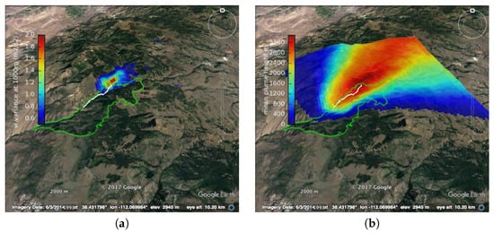 To provide insight into the second western burn at the North Kaibab site, a simulation was performed for day 09/05/2008, identified based on the weather observations from the QLBA3 weather station as the most typical day meeting the burn criteria defined in Table 2. In the North Kaibab case, Figure 9a shows that the smoke layer is more uniformly distributed across the first 1500 m than in the Fishlake case, with no evident concentration peak. Figure 9b shows lower simulated plume top heights than in the Fishlake case. They increase gradually over the first 4 h and stabilize at around 2000 m, 200–700 m lower than in the Fishlake runs.