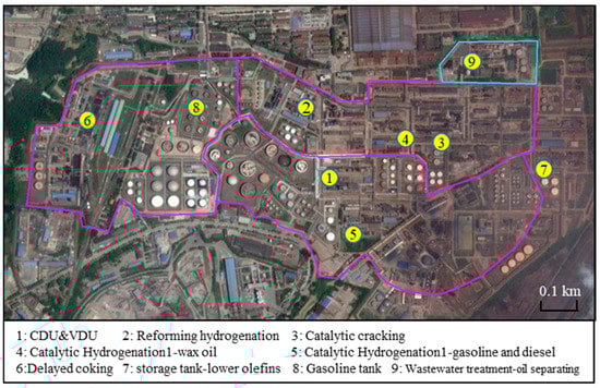To characterize the chemical speciation of VOCs from the petroleum refinery, a total of nine samples were collected inside the manufacturing facilities as depicted in Figure 1. All of the units could be divided into three categories: oil refinery (OR), storage tank (ST), and wastewater treatment (WT). Six samples including regular and reduced pressure distillation (CDU & VDU, OR1), reforming hydrogenation (OR2), catalytic cracking (OR3), catalytic hydrogenation (OR4 with wax oil and OR5 with gasoline and diesel), and delayed coking (OR6) were taken in the oil refinery sector. Leakage of storage tanks and wastewater treatment facilities were also previously identified as the major fugitive emission sources [19,20,21]. Therefore, samples from two tanks where lower olefins (ST1) and gasoline stored (ST2) and one wastewater treatment sector for oil separating (WT) were collected.