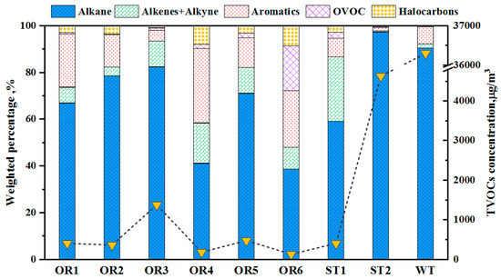The total mass concentrations and chemical structures of the 86 analyzed VOC species measured at various process units are depicted in Figure 2. Figure 2 illustrated the overall VOC group patterns and the sum of all measured VOCs (TVOCs) mass concentration from different processes including oil refinery (OR1–OR6), storage tank (ST1,ST2), and wastewater treatment (WT). The highest mass concentration of TVOCs reaching 36,302 μg/m3 was observed in the WT sector, confirming that wastewater treatment facilities were important in the process of VOC emissions. The mass concentrations of VOCs varied from 132 to 1377 μg/m3 in oil refinery units, while significant variations were found between the olefin tank and gasoline tank, where 405 μg/m3 and 4630 μg/m3 of TVOCs were detected, respectively. This obvious difference may attributed to the different emission strength and diffusion conditions during sampling.