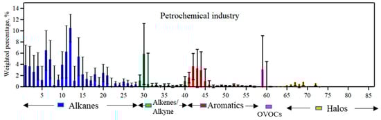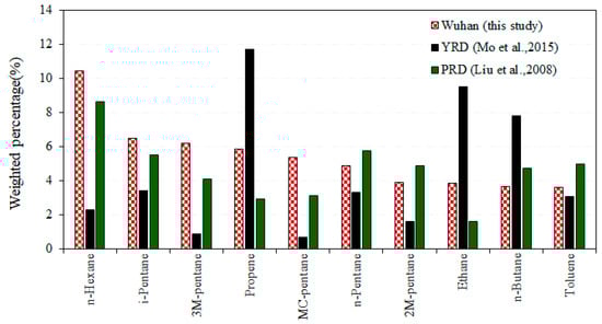 VOCs from petrochemical facilities were characterized by previous studies with a focus on assessing their impact on the environment [23,24,25]. Recent research has been devoted to the establishment of the source profile of the petrochemical industry and to identify specific VOC emissions originating from the various manufacturing processes. Liu et al. (2008) collected seven ambient samples in a selected petrochemical industrial area (PRD) and reported the VOC chemical structures of different oil refinery sections [26]. Mo et al. (2015) investigated emission characteristics of VOCs from various process units in the petrochemical, basic chemical, and chlorinated chemical plants in the YRD region and compiled the composite profiles for each sectors. The top-10 species in the composite profiles of petrochemical in this study and their proportions in other studies are compared and listed in Figure 4.