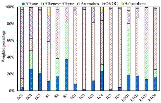 As shown in Figure 5, emission characteristics of the four sectors in automobile manufacturing workshops differed from each other. The possible reasons were the differences in raw and auxiliary materials used, manufacturing processes, and treatment strategies. OVOCs were the largest group in EC1 and EC2, while aromatics were most abundant in EC3, reflecting the fact that both water-based and oil-based paints may be used in the electro-coating process. For the PVC sealing unit, aromatics dominate the chemical compositions of S1and S2, while S3 was characterized by high loadings of alkanes, alkenes, and alkyne. This is because S3 was collected at the funnel of the baking room where exhaust was collected and treated by catalytic combustion. Therefore, VOC compositions measured in this sample embodied the character of the combustion process, which broke down macromolecular organic chemical components into smaller molecules. Similarities in terms of VOC composition patterns were observed in the top-coating sector (TC1–TC6), and aromatics were consistently the largest VOC group with contributions up to 52.6–94.6% of the total mass weight. RTO facilities were equipped in each baking room to collect the exhaust after the drying process. Among them RTO1–RTO4 were sampled at the funnel of the baking units in the top coating system. Therefore, chemical structures of VOCs emitted from the RTO exhibited the combination of solvent use and combustion characters.