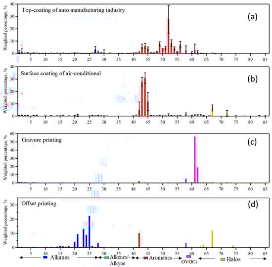 Differences between emission compositions from top coating and those from other process units were significant, and in consideration of sample’s representativeness, the profiles of six top coating samples were averaged into an integrated source profile to represent the average emission from auto coating industry. Figure 6 illustrates the source profile of the auto industry (Figure 6a) together with chemical compositions of VOCs from surface-coating of air-conditioning (Figure 6b), gravure printing (Figure 6c), and offset printing (Figure 6d).