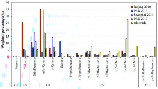 All the profiles presented in the literature agree that aromatics were consistently the largest VOCs group in the automobile coating industry, but the proportions of individual compounds were different. Therefore, to better understand the local emission characteristics, major aromatic VOCs and their contributions to the total emissions were compared and are illustrated in Figure 7.
