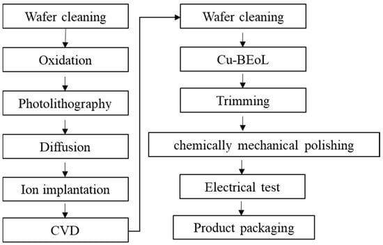 Process flow chart of a typical integrated circuits manufacturing enterprise. (Note: CVD: chemical vapor deposition, Cu-BEol: copper wiring).