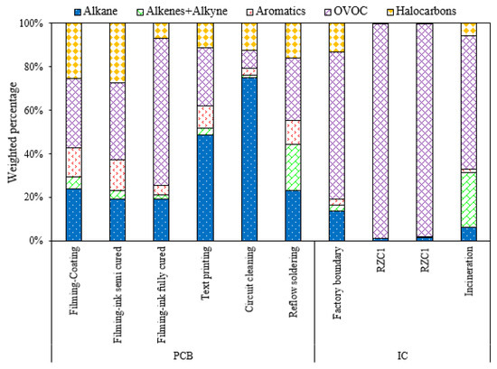 There was a large difference in VOCs composition among the different sectors in PCB manufacturing, while a similar composition of VOC emissions was observed for four units in IC industry. In case of the coating process in the filming sector of PCB manufacturing, OVOCs and halocarbons dominated the chemical structure, with acetone being the largest contributing species (13.3%), followed by ethyl acetate (12.8%) and dichloromethane (9.3%), as shown in Table 3. The composition of VOCs from the ink semi-cured process in the filming process was similar to that of coating units, and acetone was consistently the most abundant species (28.5%), whereas 1,2-dichloroethane was the second largest contributor, accounting for 11.7% to the total mass concentration. OVOCs emissions were much more significant form ink fully-cured process than that in ink semi-cured unit because the high loading of acetone in this section, which contributed 62.4% of the total emissions. Variations can be observed among the composition of VOCs from text printing, circuit cleaning, and the filming process. For example, the alkanes’ contribution was higher in the VOC emissions from text printing and circuit cleaning. Iso-pentane was one of the major species emitted from text printing sector except for acetone, 7.0% of the total, and may be used as a solvent in the printing process. I-Pentane and cyclohexane were the two largest contributing species in circuit cleaning, accounting for 17.0% and 12.0%, respectively. For reflow soldering, the most important species were acetone (23.2%), acetylene (17.1%), and propane (6.3%), and the light hydrocarbons were mainly attributable to the high temperature and combustion process.