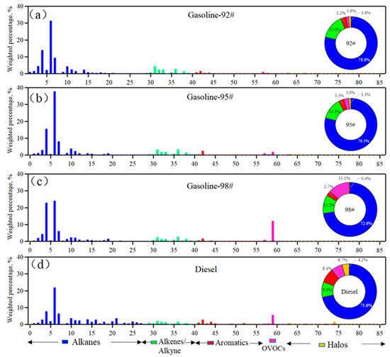 VOC source profile for gasoline and diesel; (a) gasoline-92#; (b) gasoline-95#; (c) gasoline-98#; (d) diesel-0#.
