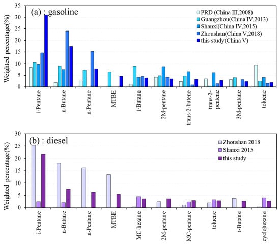 Figure 12 shows the top 10 species in gasoline and diesel vapor measured in this paper and their contributions in previous studies. In terms of gasoline, it can be found that all these profiles show the same three major compounds: n-butane, i-pentane, and n-pentane. However, fractions of these species were much more enriched in the gasoline vapor in accordance with China V (this study and Wang 2018) [35]. Instead, the percentage of toluene has been reduced gradually, from 9.5 wt % in PRD (China III) to 1.9 wt % in this study (China V). Source profiles data of diesel evaporation within last 10 years were hard to obtain, and only two sets of composition data were available and illustrated in Figure 11b [34,35]. In the case of diesel refueling emissions, the percentage of C4–C5 alkanes from our study were much higher than that reported by Wang et al. (2018) measured in Zhoushan City, and He et al. (2015) investigated in Shanxi Province. It should note that n-undecane was the most abundant species in the source profile of diesel vapor measured by He et al., accounting for 49.2% of the total mass. The great difference may attributed to the high uncertainty in the data due to the limited number of samples tested. Therefore, more work is needed in order to generate local source profiles that are more representative.