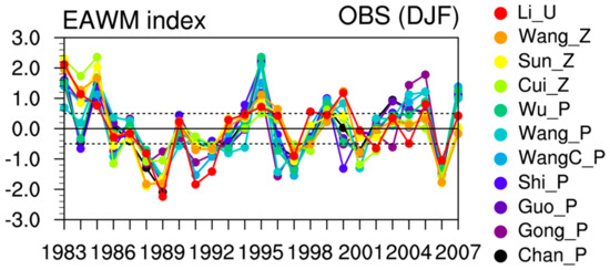 The EAWM index is often used efficiently to quantify the intensity of the EAWM and describing its climate impacts and responsible mechanisms. Therefore, many studies have applied different methods to construct a simple and representative EAWM index [4,19,20,21]. Most of the indices were primarily defined by the circulation variables of the EAWM, such as the land-ocean pressure contrast, the low-level wind, the East Asian trough and the upper zonal wind shear [22]. Recently, Wang and Chen [9] proposed a new sea level pressure (SLP)-based index considering both the east-west and the north-south pressure gradients. They suggested that the new index performs better in describing the surface air temperature variations over East Asia compared with previous indices. Meanwhile, some investigators use temperature to define the EAWM variability [1,23]. Wang et al. [1] identified two dominant temperature (the northern and southern) modes over the EAWM region, which explain much of temperature variability over the entire Asian region. They found that most of the existing EAWM indices tend to describe the southern temperature mode.