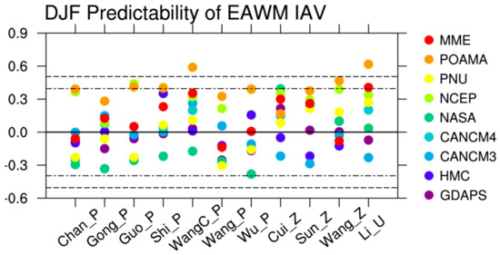 As the EAWM exhibits strong interannual variation (IAV, Figure 1), we assess how well the APCC MME forecast models can capture the IAV of the EAWM. Figure 2 shows the temporal correlation coefficients of normalized monthly mean EAWM indices between the observed and the individual model simulations as well as the MME. The results show that the prediction skill of the EAWM IAV depends not only on the model but also on the EAWM index. In other words, some indices such as WangC_P, Cui_Z and Li_U exhibit higher correlation than other indices and some models such as POAMA and NCEP reproduce better prediction skill than other models. In particular, the POAMA model captures significantly high score when WangC_P and Li_U indices are used. To select a best EAWM index among the candidate indices for APCC MME seasonal forecast, the prediction skill in climate models is an important criterion. In this regard, WangC_P and Li_U have an overwhelming advantage to be selected as the suitable index. It is evident that both indices have significant prediction skill, possibly due to the inclusion of both the tropical and the extratropical factors in their definitions. The other indices usually reflect only one aspect of both factors [22]. This result suggests that the EAWM index should include both the tropical and the extratropical processes in order to well-represent the nature of the EAWM, consistent with previous studies [2,41].