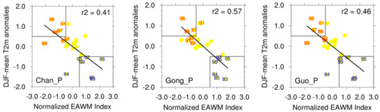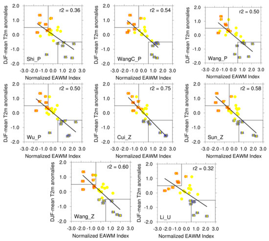 Scatter plots of normalized EAWM index vs. DJF-mean temperature anomalies averaged over East Asia (100–145° E, 20–50° N) for the period 1983–2007 based on the EAWM index defined by Wang and Chen (2014).