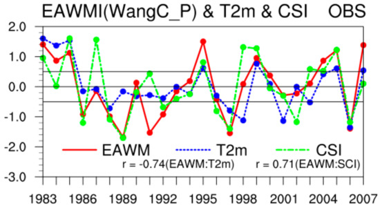 To analyze how the EAWM index by WangC_P signifies the connection with synoptic activity over the tropical Asia, the EAWM index, the cold surge index [43] and DJF-mean 2m air temperature are displayed in Figure 4. The EAWM index is significantly correlated both with the temperature over East Asia and with the cold surge index as −0.74 and 0.71 at the 99.9% confidence level, respectively. When the EAWM is strong, the cold surges are active and cold anomalies over East Asia are dominant. The result from Figure 4 indicates that the selected index developed by Wang and Chen [9] is an effective way to describe the winter-mean surface air temperature variations connected with the EAWM, especially for extreme cold winters.