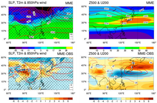 To evaluate the performances of models in representing the climatological features of EAWM, the DJF-mean circulation over East Asia based on the NCEP R2 dataset (hereafter referred to as “OBS”), the MME of eight individual models and their differences are plotted in Figure 5. The MME well-represents the major features of EAWM, such as pressure gradients between the Siberian high and the Aleutian and Australian lows, the prominent low-level northerly wind and the strong meridional temperature gradient over the eastern coastal region. Compared to observation, the Siberian high in the MME is displaced slightly to the south and weakened over northern Eurasia. In addition, the MME generally captures the strength and position of the East Asian trough and the mid- to upper troposphere jet stream over East Asia, although there are some deviations in the magnitude and the center locations. The model biases in MME can be explained reasonably as follows. The weak zonal pressure gradient between the Asian continent and the neighboring oceans leads to weakened northerly winds over northeastern Asia, which is directly related to the strength of the EAWM. As the northerly wind over northeastern Asia becomes weak, it brings less cold air advection from Arctic and produces a weaker meridional temperature gradient. Moreover, the weaker monsoon flow leads to a weaker polar jet stream over East Asia, which is closely related to the meridional temperature gradient at the surface with the thermal wind relationship.
