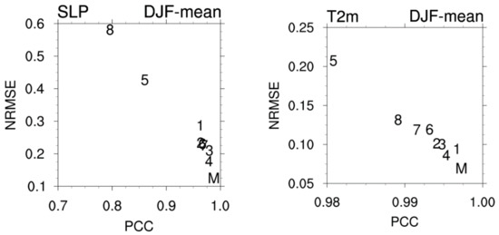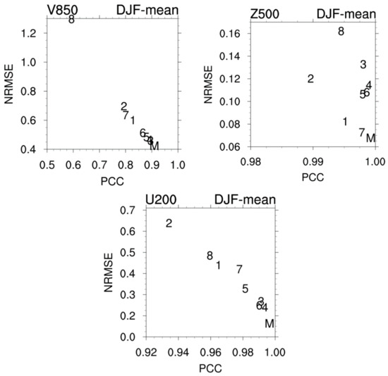 Performance of forecasts models and their MME on DJF mean sea level pressure (SLP, hPa), 850 hPa meridional wind (V850, m s−1), surface air temperature (T2m, °C), 200 hPa zonal wind (U200, m s−1) and 500 hPa geopotential height (Z500, gpm). The abscissae and ordinates are the pattern correlation coefficient (PCC) and the domain-averaged RMSE normalized by the observed spatial standard deviation (NRMSE) of 8 models (marked by the model number in Table 1) and the MME (marked by “M”), respectively. The domain used is the region of 60–180° E, 0–60° N. Note that each plot has different axis.