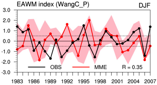The above analysis indicates that the climate models used in this study are capable of capturing the major features of the DJF-mean circulation over East Asia. How well do the models predict the EAWM IAV? To answer this question, we use the index selected in Section 2.2 as an efficient way to describe the prediction skill of EAWM IAV. Figure 7 compares the temporal variation of the EAWM indices from OBS and MME. Both indices experience strong variability; however, they show different phases in most years. Although the correlation coefficient between the observed and predicted indices is 0.35 (significant at 90% confidence level), the MME fails to capture the observed intensity of EAWM especially in extreme winter years. The shading with pink color indicates the model spread of eight models and implies a wide range of prediction skill for EAWM intensity that exceeds one standard deviation of EAWM IAV in almost all years. Overall, the models are still quite diverse in simulating the EAWM IAV, even varying in the sign of EAWM intensity of each year. This result implies that there are still many uncertainties in predicting the EAWM IAV and accurate prediction of the EAWM variability is still a challenge, which is consistent with previous result [44]. On the other hand, it seems there is correlation shift before and after 1997. For the recent period (1998–2007), the MME exhibit relatively higher correlation skill, presumably due to the intensified ENSO-EAWM relationship in the observations and predictable component of EAWM influenced by ENSO (or relatively higher skill of the teleconnection to the EAWM by ENSO) [44].