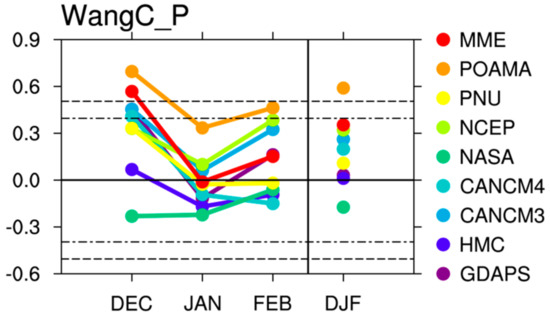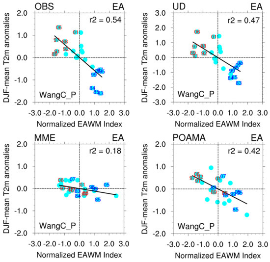 In order to assess a best fitted EAWM index in operational climate centers, another important criterion is how well the index can represent the surface air temperature anomalies associated with the EAWM. Therefore, we examine the performances of indices in representing DJF-mean temperatures variation over East Asia. Figure 3 shows the covariabilities of each EAWM index versus DJF-mean surface air temperature anomaly averaged over the region of East Asia (20°–50° N, 100°–145° E) [42]. The “R-squared” (r2), a standard way of measuring the proportion of variance we can explain in one variable, is inserted in the upper right corner of each plot. Among the 11 indices that participate in the comparison, five indices (Cui_Z, Wang_Z, Sun_Z, Gong_P, WangC_P) explain greater than 50% of the variance in DJF-mean temperature. Although the indices based on the geopotential height such as Cui_Z, Wang_Z and Sun_Z explain higher variance in temperature, they fail to capture the extreme cold winters associated with the strong EAWM. Taking a 0.5 standard deviation of EAWM index and 0.5 °C of temperature anomaly as a criterion, both Gong_P and WangC_P show reasonable performance in delineating the interannual variations of the EAWM including the extreme cold winters. For the 25-year period, the high (low) EAWM indices of Gong_P and WangC_P correspond to seven (three) extreme cold (warm) winters over East Asia. It is obvious that both Gong_P and WangC_P properly describe the relationship between the intensity of the EAWM and winter temperature extremes over East Asia. Meanwhile, the Li_U with high prediction skill for EAWM variation shows relatively lower performance in describing the East Asian temperature. Considering the criteria mentioned in Figure 2 and Figure 3, it is suggested that the WangC_P could be the best fit for monitoring and predicting the EAWM in the APCC MME seasonal forecast system.