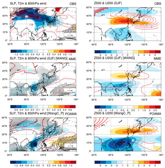 Regression onto the normalized EAWM index defined by Wang and Chen (2014) in the NCEP-R2 dataset of the DJF mean (left panels) sea level pressure (SLP, contours, hPa), surface air temperature (T2m, shading, °C) and 850 hPa winds (vectors, m s−1) (right panels) 500 hPa geopotential height (Z500, contours, gpm) and 200 hPa zonal wind (U200, shading, m s−1). The upper panels are for the observations based on NCEP-R2 (OBS) and the middle and bottom panels are for the MME and POAMA results, respectively. Only values exceeding the 95% confidence level are shown. Note that the shading and contours in MME are different to those in OBS and POAMA.