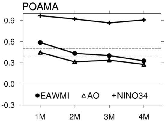 Figure 10 shows the correlations of the EAWM index, AO index and Nino 3.4 index between the OBS and the simulation by POAMA for different lead months. The skill of the EAWM decays persistently with lead time, which shows marginal skill for up to three months. Because of the significant impacts of the ENSO and AO on the prediction of EAWM, we also display the prediction skill of these factors. While the model predicts the variation of Nino 3.4 SST very well for all time leads, it shows marginal skill of the AO only for the one-month lead. The prediction skill of EAWM rapidly decreases from the one-month lead to the two-month lead and then slightly decreases with lead time.