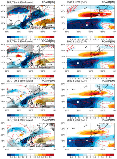 To access which components of the EAWM appear to have a larger impact on the prediction skill, we analyze the EAWM-related circulation anomalies for different lead times (Figure 11). The anomalies in the one-month lead with high skill are more similar to the observations than longer lead months and their magnitudes gradually weaken with lead time. In particular, the predicted anomalies in the SLP, T2m and 850 hPa wind over the Asian continent vary sharply from the one-month lead to the two-month lead. The model does not capture the EAWM-related circulations over the Asian continent (north of 35° N), except for the one-month lead prediction. In the upper atmospheric circulation, the anomalies do not show consistent features for long leads. For example, the anomalies in Z500 and U200 of the three-month lead are relatively well represented than those of the one-month lead compared to the two- and four-months leads. This result indicates that the predictability of EAWM strongly depends on the skill in predicting the anomalies over Asian continent. Taking into account the significant link of the EAWM with the ENSO (AO), predictability of EAWM is also influenced by the model’s ability of the teleconnection to the EAWM by ENSO (AO). According to the previous analysis by Wang et al. [1] and Jiang et al. [32], the ENSO primarily affects the tropical components of the EAWM, while the AO affects the extratropical components of EAWM from the high latitude continent. The model only captures the AO-related circulation over the Ural Mountains and the North Pacific for the one-month lead, although the magnitude of the predicted circulation is weaker than the observation (not shown). This result supports that the POAMA can only predict the EAWM and partly is due to the skillful prediction of AO at one-month lead.