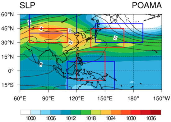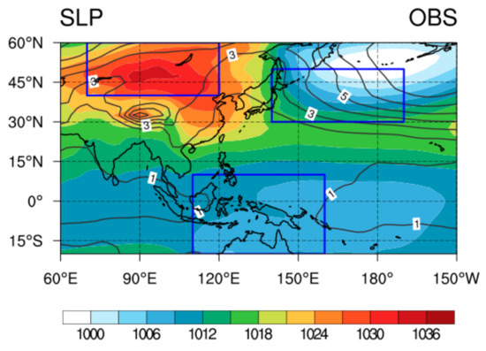 For the sake of a more reliable seasonal forecast of the winter season, efforts have been made to improve the forecasting techniques of EAWM intensity. We recommend the use of the modified EAWM index, which is newly calculated considering the model bias of POAMA. Figure 13 displays the SLP winter climatology with the SLP regions selected to define the original (blue color) and modified (red color) EAWM index. The original EAWM index developed by Wang and Chen [9] is calculated as follows: