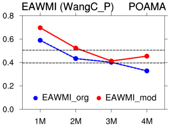 To evaluate the performance of the modified index, we compare the prediction skill of the original EAWM IAV with that of the modified index. The results show that the modified EAWM index improves the temporal and spatial variations of the EAWM IAV with higher fidelity than the original index (not shown). Moreover, the index based on the modified area shows better predictability than that based on the original areas and the prediction skill maintains statistically significant levels for most lead months (Figure 14).