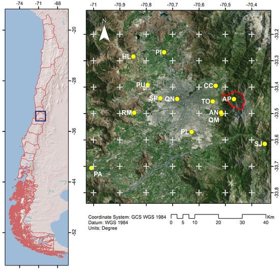 Santiago ( S; W) exhibits a semi-arid Mediterranean climate, with a mean annual precipitation of 310 mm and about 25 rainy days during the austral winter (May–September) and warm, dry summers []. This general weather pattern has remained constant over time, since no trends were found on monthly rainfall, mean and maximum annual precipitation for the period 1950–2018 using the Mann–Kendall test [,], with a significance level. Nevertheless, central Chile—and Santiago in particular—have experienced a prolonged drought since 2010 onwards that seems to herald drier conditions in the future [].