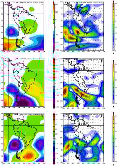 The frontal system moved from north to south, with negative anomalies in the atmospheric pressure and geopotential height at 500 hPa ( geopotential meters). At the same time, an intensification of both subtropical and polar jet streams took place at 250 hPa, allowing higher wind intensities in the system nucleus (positive anomalies of 35 m/s in the wind vectors), favoring the cloudiness development over central Chile (Figure 2, central row).