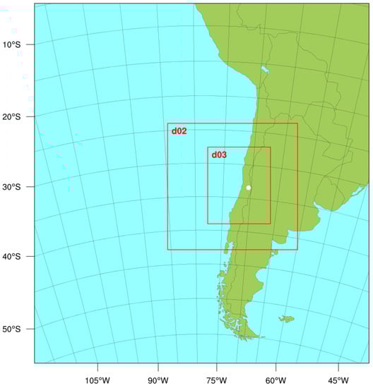 The domain of the WRF simulations was composed of three nested grids with 54, 18 and 6 km of resolution. These were based on a Lambert Projection centered at Santiago de Chile, interacting with each other through a two-way nesting strategy (Figure 3). The biggest or parent domain (d01, 54 km) covered South America’s western region, the Pacific and part of the Atlantic Ocean. As recommended by the DMC, the objective of its extent is to embrace South America and a good portion of the Pacific Ocean, which allows capturing phenomena approaching the continent beforehand. The first nested domain (d02, 18 km) embraced Chilean and Argentinian central regions and the Pacific Ocean near the shore. The innermost domain (d03, 6 km), the main focus of this study, covered a reduced portion of the Pacific Ocean, central Chile and the Andes mountains.