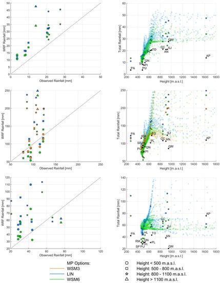 To assess the local performance of WRF over the rainfall events, we first characterized the overall rainfall orographical gradient using total rainfall amounts registered in all the meteorological stations (Table 1). Figure 4 compares total simulated rainfall amounts (considered to be the mean of the values simulated using the three lead times for every MP option) against the observed ones. Different markers according to the elevation are used in the figure. The left panels compare in every meteorological station simulated and observed data, and the dashed line corresponds to the 1:1 ratio. The right panels’ plot rainfall against height, the scatter in the plot represents simulated values for several locations in Santiago city and the west hill slope of the Andean foothills, to give a spatial context for the WRF rainfall distribution.